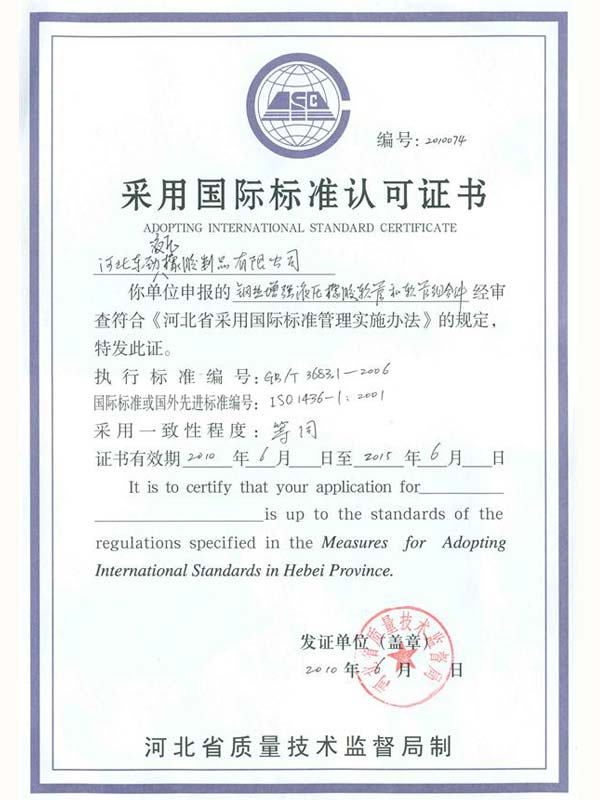• 鋼絲編織管采用國際標準認可認可證書